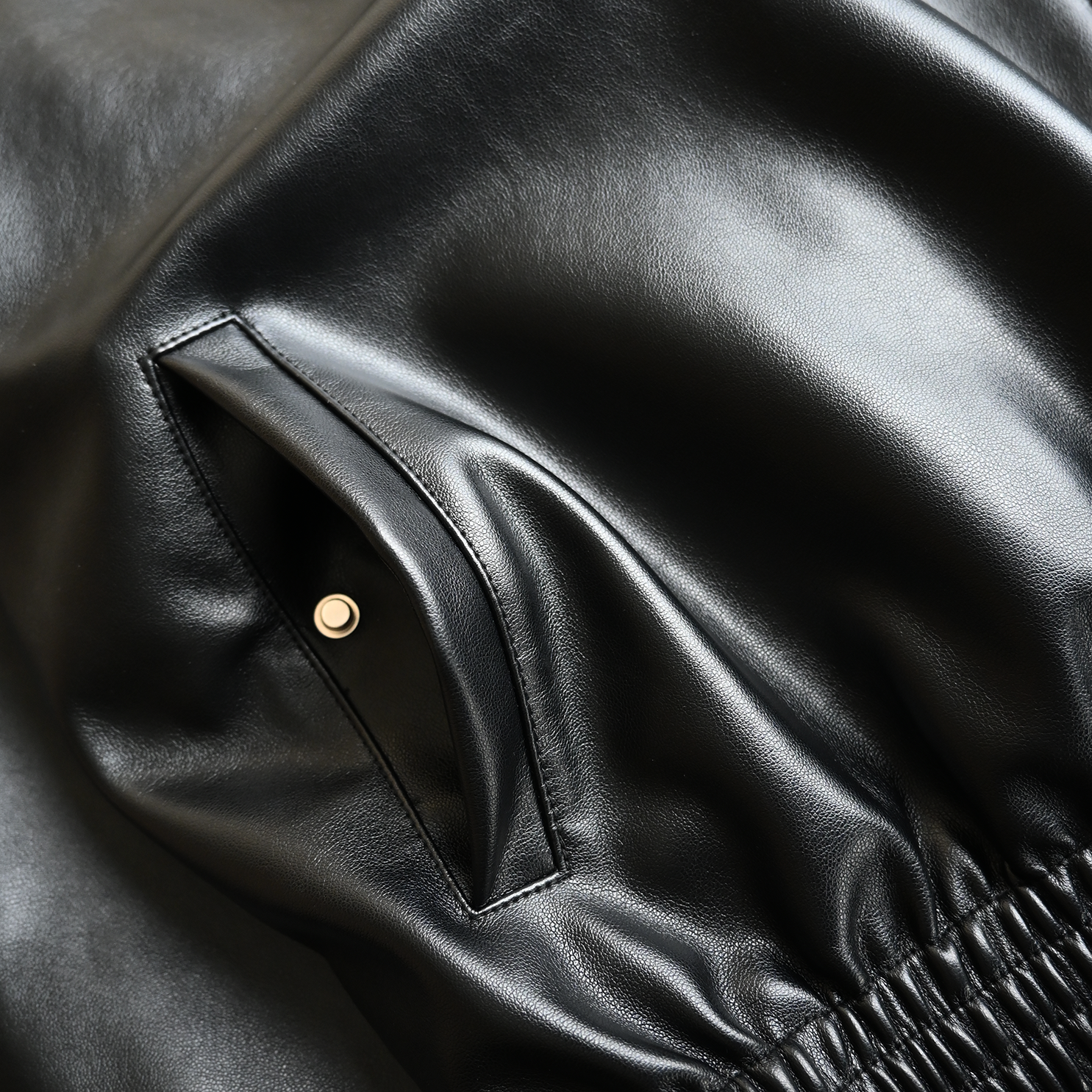 A REVERSIBLE OUTERWEAR JACKET CRAFTED WITH A SUPPLE VEGAN LEATHER EXTERIOR ON ONE SIDE AND A FULLY WATERPROOF NYLON SHELL ON THE OTHER. THE LEATHER FACE FEATURES DEEP HAND POCKETS WITH A HIDDEN BUTTON CLOSURE FOR A CLEAN, MINIMAL PROFILE, WHILE THE TRACK JACKET SIDE OFFERS ZIP-SECURED POCKETS WITH DURABLE YKK HARDWARE, 3M REFLECTIVE PIPING AND A 3M BACK STITCHED LOGO. BUILT WITH A WIDE, RELAXED SILHOUETTE AND A TAPERED HEM FOR STRUCTURE, THIS JACKET MAINTAINS A HIGH COLLAR NECK ACROSS BOTH SIDES FOR SHAPE AND WEATHER CONTROL. ALL ORDERS SHIP IN 2–3 WEEKS FROM OUR WAREHOUSE IN UTAH.
